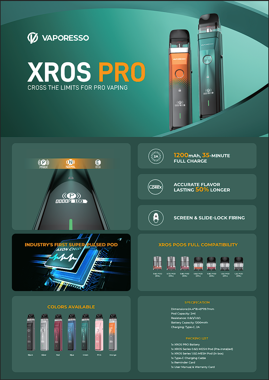 XROS PRO is the first to feature a 0.4Ω pod and adjustable power up to 30W in the XROS series, offering an RDL Pod experience. Crossing the limits to pro experience of excellent flavor, it features AXON Super Pulse mode and COREX Heating Tech. Crossing the limits to pro experience of refined operation, it features the practical screen and button.